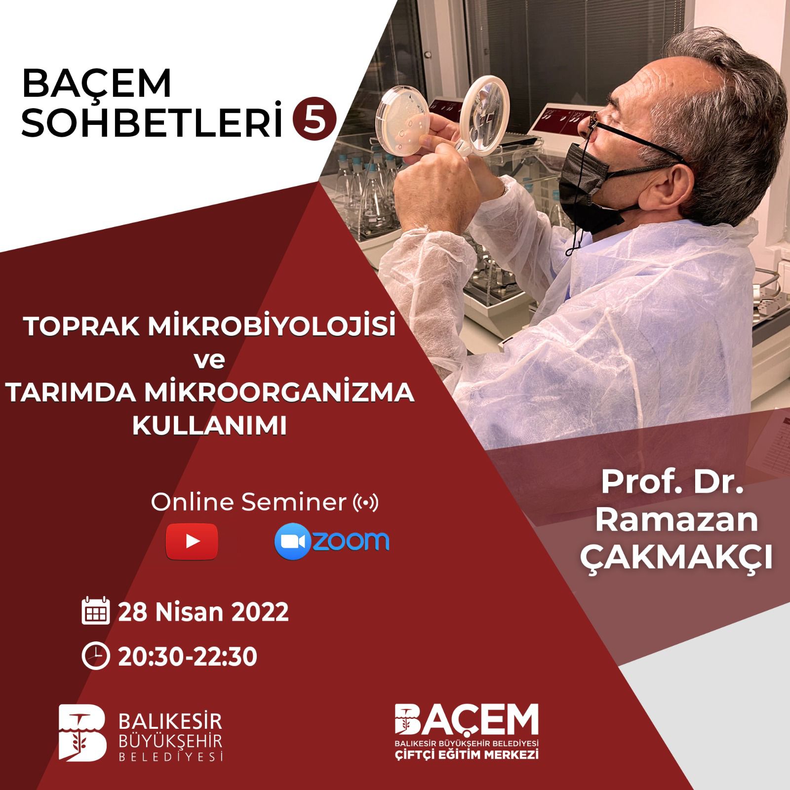 Baçem Sohbetleri online seminer programımızın bu ay ki konuğu Çanakkale Onsekiz Mart Üniversitesi Ziraat Fakültesi Öğretim Üyesi Prof. Dr. Ramazan Çakmakçı "Toprak Mikrobiyolojisi ve Tarımda Mikroorganizma Kullanımı" konularından belediyemiz YouTube kanalından canlı yayınlanacak seminerde 28 Nisan 2022 Saat: 20:30 BAÇEM Şube Müdürümüz Nazım TANRIKULU' nun konuğu olacaktır.