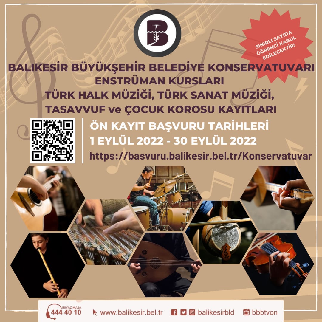 Balıkesir Büyükşehir Belediye Konservatuvarı 2022-2023 dönemi enstrüman kursları Türk Halk Müziği Türk Sanat Müziği Tasavvuf ve Çocuk Korosu talepleri internetten online başvuru şeklinde 1 Eylül 2022-30 Eylül 2022 tarihleri arasında alınacaktır.