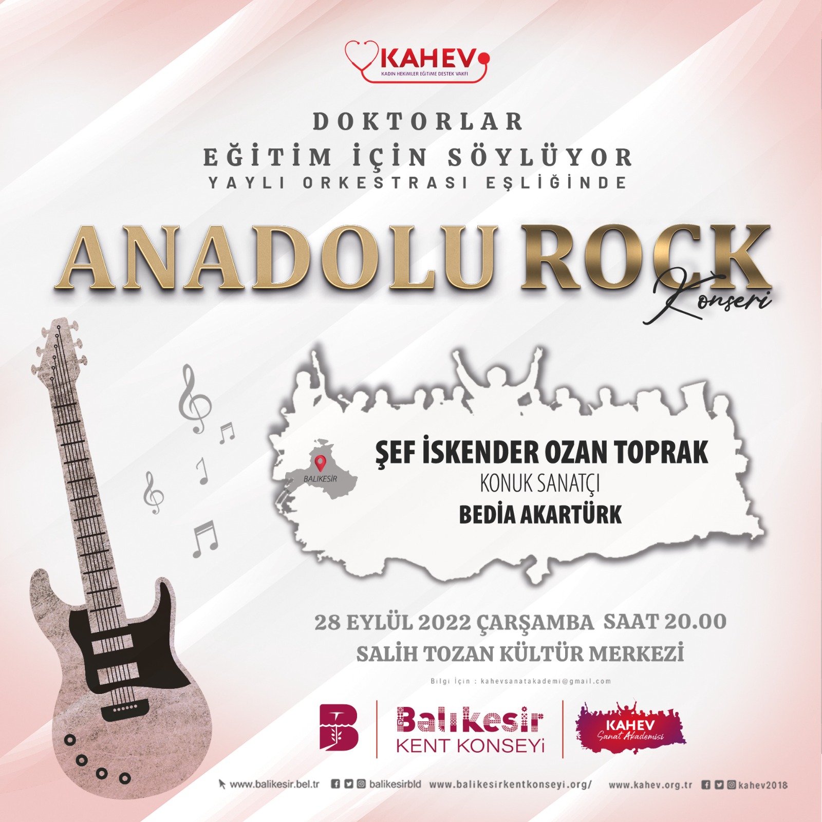 Yaylı Orkestra eşliğinde Şef İskender Ozan Toprak ve konuk sanatçı Bedia Akartürk’ün katılımları ile📆28 Eylül 2022 ⏱️ 20.00’de 📍Salih Tozan Kültür Merkezindeki ‘Anadolu Rock Konseri’ne bekliyoruz.