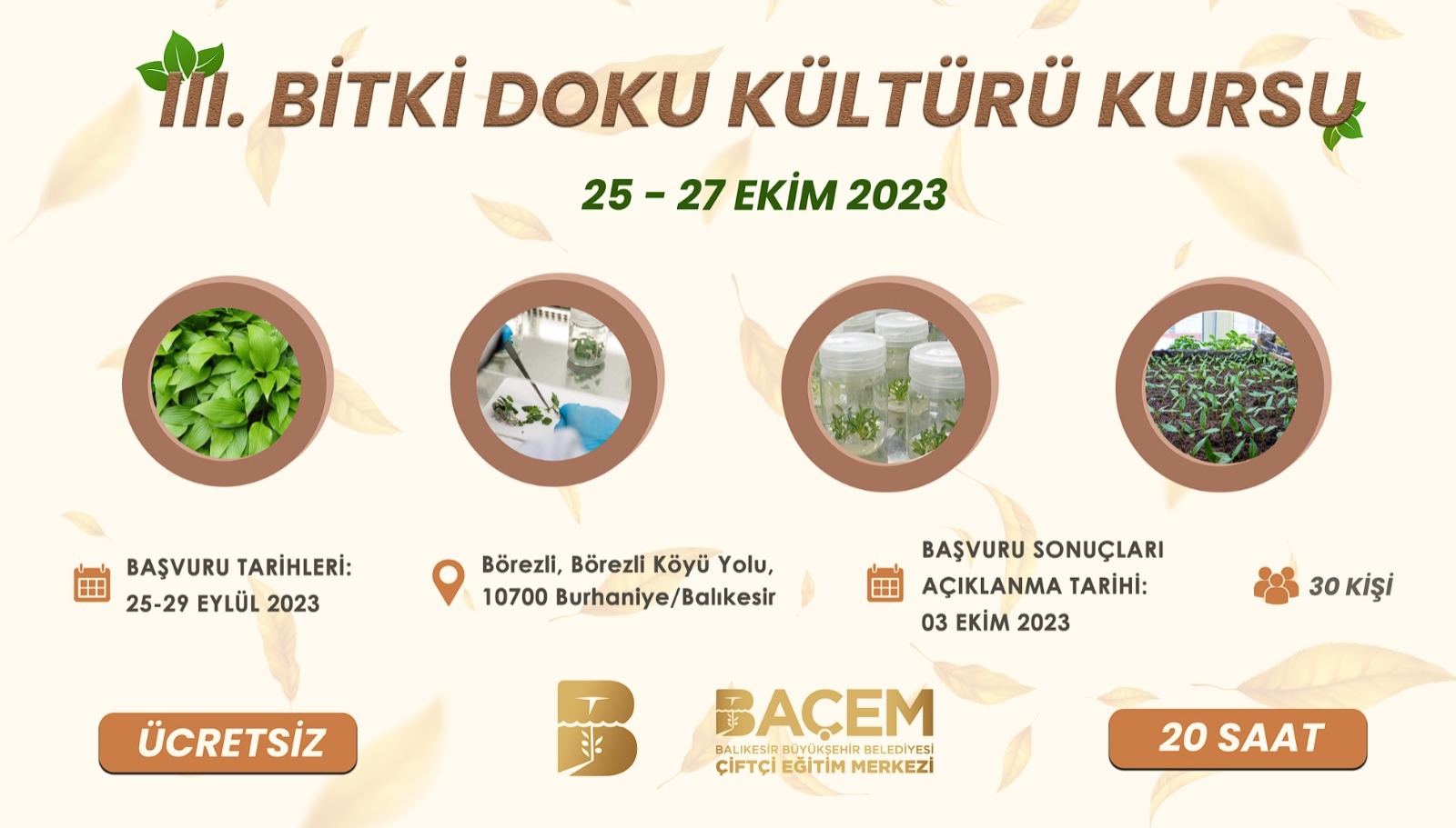 Başvuru Linki : https://basvur.balikesir.bel.tr/BDK3BAÇEM'de üçüncüsünü düzenleyeceğimiz ''Bitki Doku Kültürü Kursu'' 25-27 Ekim 2023 tarihlerinde gerçekleşecektir. Kursumuza diğer kurslarımızda olduğu gibi paylaştığımız link üzerinden, online başvuru sistemi yöntemiyle başvurular alınacaktır. 2 Ekim Pazartesi günü değerlendirme kurulunun başvuruları değerlendirmesi neticesinde toplam 30 asil ve 10 yedek kursiyer belirlenecektir. Sonuçlar 3 Ekim Salı günü balikesir.bel.tr , bacem.com.tr ve bacembalikesir ınstagram hesabımız üzerinden paylaşılacaktır.